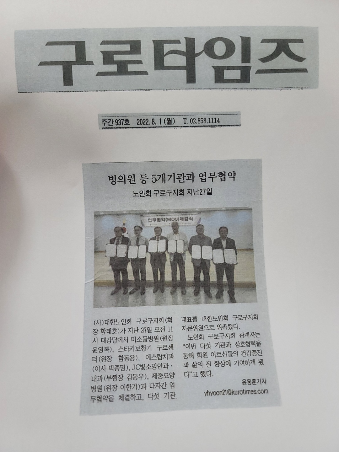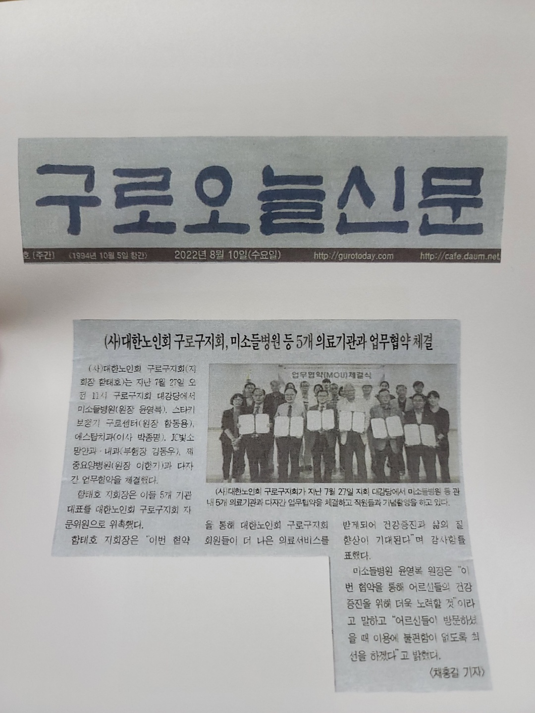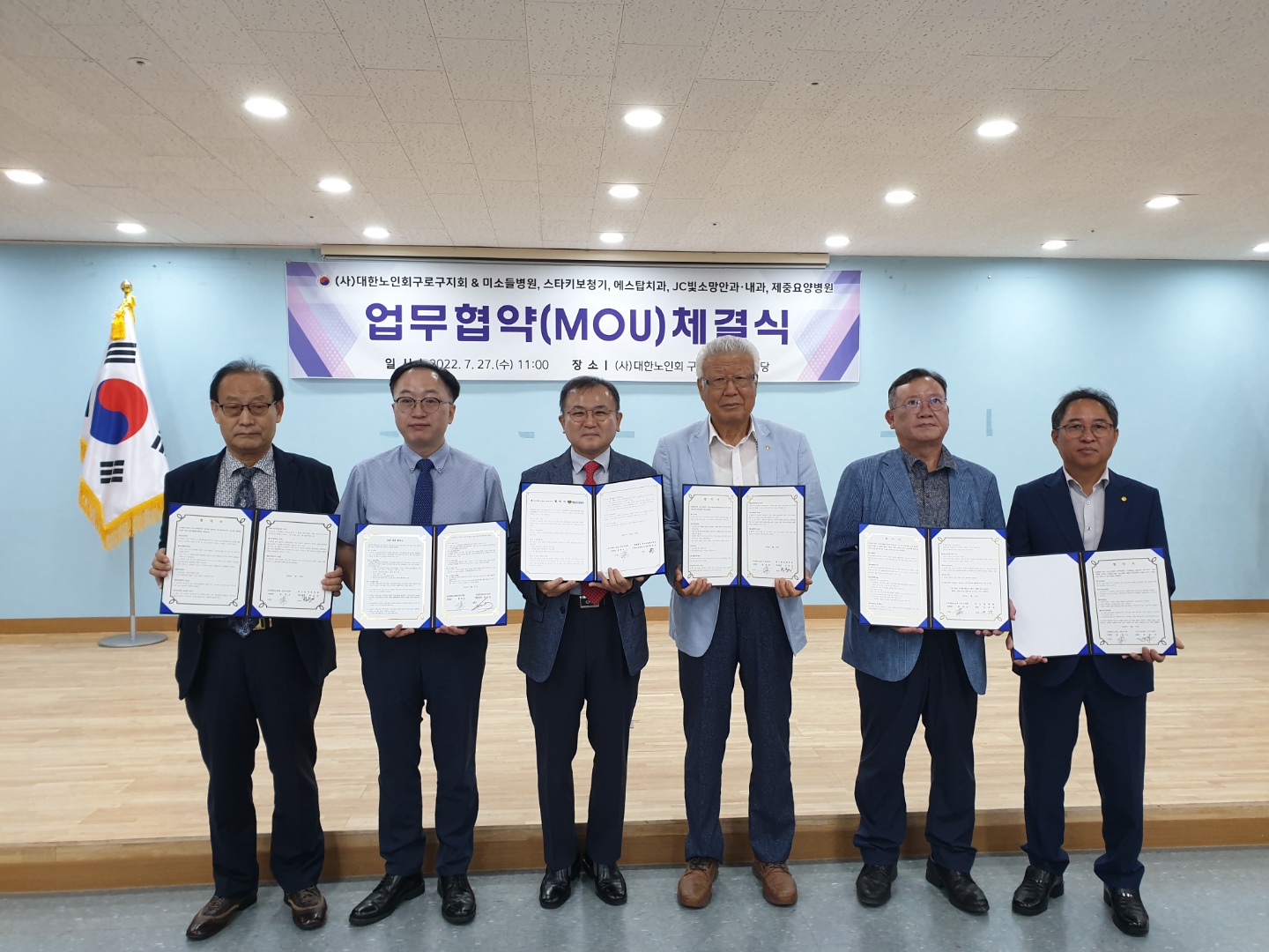 2022년 7월 27일(수) 오전 11시에 대한노인회와 구로구지회 등 업무협약 체결식을 진행하였습니다.