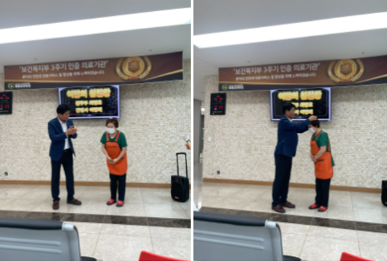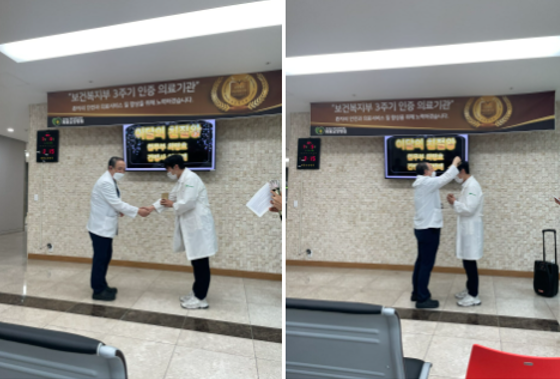 먼저 최명호 사회복지사님은 접수데스크에도 계시면서 여러가지 일을 하시는 분이신데요~ 환자분들과 보호자분들께 친절히 대해주어 칭찬이 자자하다고 합니다! 노정우 병원장님께 축하의 말씀과 상품권을 증정 받았답니다~ 보여지지 않는 정말 너무도 친절한 사원들이 많이 있으니 그분들께도 감사의 인사를 전달해 드리고 싶다고 하셨습니다.