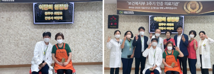 이명례 간병사님께서도 정용문 감사님께 축하의 말씀과 상품권을 전달받았는데요~ 항상 묵묵히 자신의 자리에서 최선을 다하겠다 말씀하셨습니다. 최명호 사회복지사님, 이명례 간병사님 축하드립니다!!